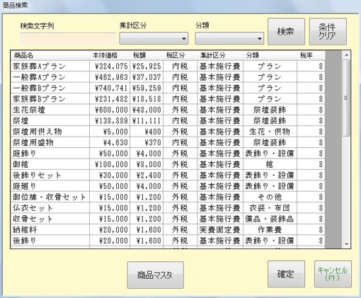 ○商品検索 商品は集計区分や商品分類から絞り込んで検索ができます。 商品名のあいまい検索もできます。 |